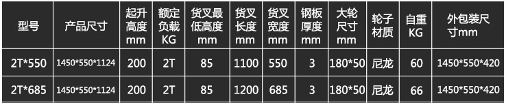 搬運車分為兩種型號:550型和685型,其具體的相關尺寸見上圖所示。其輪子也分為2種,一種是尼龍輪,一種是橡膠輪。尼龍輪適合水泥地面,橡膠輪適合大理石、油漆、環氧地面。